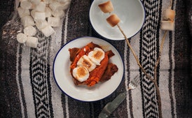 ['4 medium sweet potatoes', '4 tablespoons (1/2 stick) salted butter', '1/4 cup pure maple syrup', 'Crumbled gingersnaps (optional; for serving)', 'Roasted marshmallows (optional; for serving)']