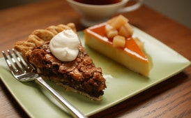 Preheat oven to 325°F. Spread chopped chocolate in even layer over bottom of prepared crust. Sprinkle nuts in second even layer, then pour filling over nuts. Bake until filling is puffed and center is just set, 45 to 60 minutes. Cool in pan on rack. (Pie can be made up to 1 day ahead. Let cool, then cover loosely and store at room temperature.)