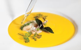 Ladle soup into chilled bowls. Spoon 1 heaping teaspoons of the tofu mixture into center. Top with a few toasted almonds and 3 melon balls. Drizzle almond oil over and garnish with fresh herbs.