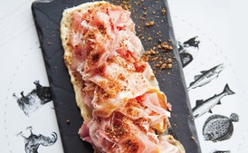 Spread aioli on plates, top with ham, and sprinkle with mustard powder.