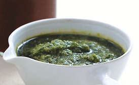 ['4 (3 1/2 x 3 1/2-inch) slices white sandwich bread, crusts removed', '2 tablespoons white wine vinegar', '4 cups (packed) fresh Italian parsley leaves (from about 2 large bunches)', '1 1/2 cups extra-virgin olive oil', '15 cornichons* (scant 1/2 cup)', '5 anchovy fillets', '1/4 cup drained capers', 'Fine sea salt', '*Tiny', 'brine-packed French pickles; available at some supermarkets and at specialty foods stores.']