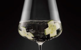 ['3 oz. Noilly Prat dry vermouth', '1 oz. club soda', 'Garnish: 1 cucumber wheel']