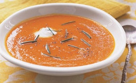 ['1 1/2 tablespoons olive oil', '1 cup thinly sliced leeks (white part only)', '1/2 large white onion, diced (about 1 cup)', '2 1/2 pounds organic carrots, chopped', '2 cups vegetable stock', '1 tablespoon chopped fresh lemongrass (or 2 teaspoons dried, tied in a piece of cheesecloth)', '3 1/2 teaspoons minced fresh ginger', '1 cup fresh carrot juice', '1/2 cup light sour cream, plus 4 tsp for garnish', 'Coarsely ground black pepper', '1 tablespoon chopped chives']