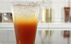 Pour the lime juice onto a small plate and spread the lavender crystals on a second small plate. Dip the rim of a 12-ounce glass into the lime juice, then dip it into the lavender crystals to lightly coat. Repeat with a second 12-ounce glass.