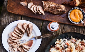 Brush pork with some preserves. Grill, turning every 4 minutes or so and brushing with any remaining preserves, until charred on all sides and an instant-read thermometer inserted into the thickest part registers 130°F, 10–12 minutes. Transfer to a cutting board and let rest 10 minutes. Slice 1/2" thick.
