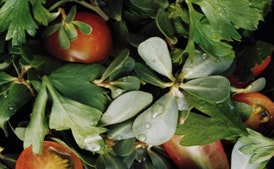 Add tomatoes, purslane, and parsley, gently tossing to coat.