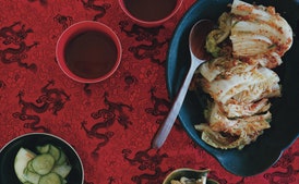 Purée garlic and ginger with fish sauce and vinegar in a blender until smooth, then pour over cabbage. Add scallions, sesame seeds, and red-pepper flakes and toss to coat.