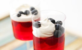 ['1 box (3 ounces) raspberry Jell-O', '1 cup fresh raspberries, plus 4 extra for garnish', '3/4 cup prepared whipped topping', '1 cup fresh blueberries']