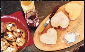 Using 4-inch heart-shaped cookie cutter, cut out 8 hearts from cake (cover and reserve leftover cake). Spread thin layer of jam over top of 1 cake heart. Spread 1 heaping teaspoon of lemon curd over; top with another cake heart. Repeat with remaining hearts, jam, and lemon curd. Sprinkle each with powdered sugar.