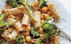 Heat oven to 450°F. In a small saucepan over medium-high heat, sauté anchovies with oil and garlic until anchovies dissolve and garlic browns. Add chickpea liquid and bouillon to anchovies; cook, stirring, until bouillon dissolves. Pour anchovy mixture into roasting pan; add chickpeas and broccoli; stir to coat. Roast 20 minutes. Cook rigatoni as directed on package until al dente. Drain rigatoni, reserving 1 cup cooking liquid. Add pasta to chickpea-broccoli mixture; roast until pasta is completely cooked, adding reserved cooking liquid a little at a time and stirring to reach desired consistency, 5 to 10 minutes. Remove from oven; let sit 5 minutes; serve topped with Romano.