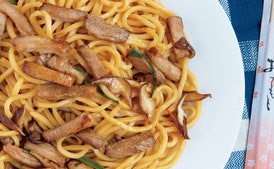 4. Add the noodles and pork. Pour in the sauce mixture and toss with tongs or chopsticks until the noodles and pork are heated through and well coated with sauce. Transfer to a platter and serve.