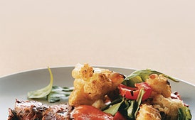 Sauteed Flank Steak with Arugula and Roasted Cauliflower and Red Peppers