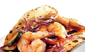 ['2 teaspoons kosher salt', '2 lb extra large shrimp, thawed if frozen, peeled and deveined', '1 cup light mayonnaise', '1 garlic clove, finely chopped', '1 chipotle chile in adobo, finely chopped', '1 tbsp extra-virgin olive oil', '1 zucchini, halved and thinly sliced', '12 corn tortillas, warmed', '2 cups thinly sliced red cabbage']