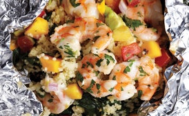 Heat grill. Fold four 18-inch-long pieces of foil in half; unfold and coat inside with cooking spray. Place 2 cups spinach in center of 1 half of each piece of foil. Combine couscous with 1/4 cup water; divide evenly among packets, placing on top of spinach. Combine shrimp, 1/4 cup cilantro, oil and 1/2 teaspoon salt in a bowl. Divide shrimp evenly among packets, placing next to couscous. Fold foil to close and crimp edges to seal; place on grill; close lid; cook until packets are fully puffed, 10 minutes. Combine remaining 1/4 cup cilantro with remaining 1/4 teaspoon salt, mango, avocado, tomato, onion, jalapeño and lime juice in a bowl. Carefully cut foil to open; stir contents; garnish with salsa before serving.