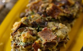 7. Add the mushrooms to the bread. Whisk the eggs in a small bowl and then whisk in a few tablespoons of the warm stock mixture. Add the eggs and the rest of the stock mixture to the bread, season with salt and pepper, and stir to combine. The dressing should be very wet; add more stock as needed. Scrape the mixture into the prepared baking dish. Cover with foil and bake for 25 minutes. Remove the foil and continue baking until the top is golden brown, 25 to 30 minutes longer. Remove from the oven and let cool for 10 minutes before serving.