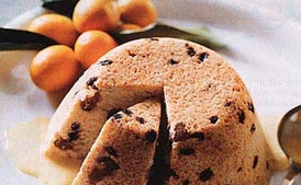 Bring water in pot to a boil and set mold on platform. Steam pudding, covered, over simmering water 1 1/2 to 2 hours (add more boiling water to pot if necessary), or until golden and puffed. Transfer pudding in mold to a rack and let stand 5 minutes. Discard foil and wax paper and run a thin knife around edge of pudding. Invert a plate over mold, then invert pudding onto plate. Serve immediately with custard sauce.