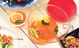 ['2 large tea bags for iced tea', '1/2 cup boiling water', '8 fresh mint sprigs', '4 cups lemonade made from frozen concentrate', '1/2 cup vodka', 'Ice cubes', '8 lemon slices']