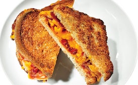 ['1/2 canned San Marzano tomato, diced', '1/8 cup chopped red onion', '1/2 garlic clove, minced', '1 tablespoon red wine vinegar', '1/2 teaspoon honey', '8 pieces whole-grain bread', '2 cups shredded lowfat cheddar, divided', '8 slices prosciutto', '4 tablespoons olive oil', 'divided']