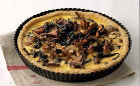 Scatter mushrooms evenly in tart shell and pour custard over them. Bake tart in pan on a baking sheet until custard is just set and slightly puffed, 35 to 45 minutes.