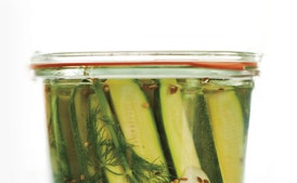 Divide hot syrup between jars to cover zucchini, leaving 1/2" space on top. Wipe rims, seal, and process in a boiling water bath for 10 minutes. Allow at least a week to pickle before eating.